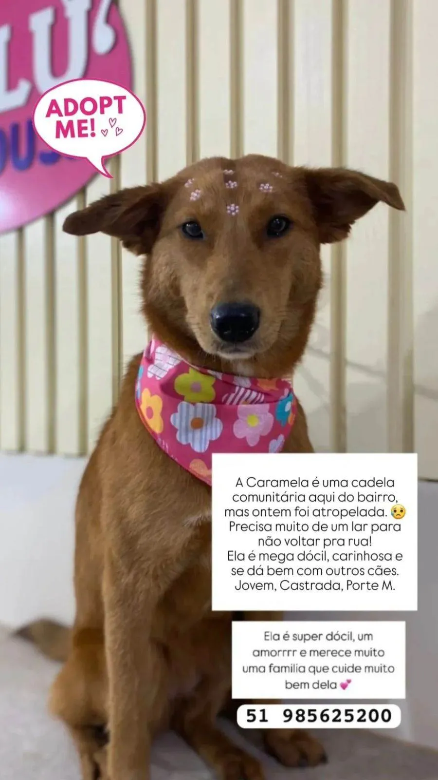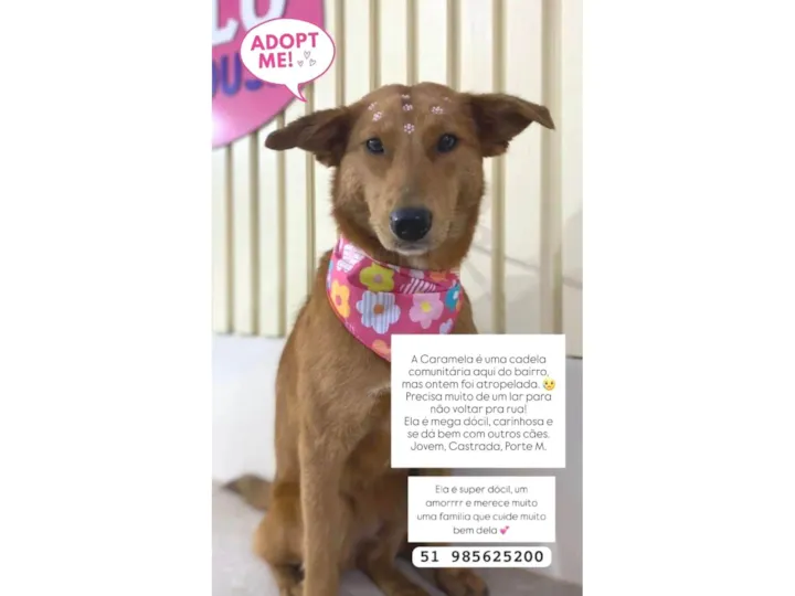 Minha chance vai demorar muito para chegar ??Caramela foi resgatada com a promessa que iríamos achar uma família e que ela não precisaria mais voltar para a rua e nem ser abandonada novamente ou ser atropelada e passar por toda dor novamente.Caramela tem 3 anos de idade , é muito alegre , brincalhona , educada , se dá super bem com outros animais , adora o ser humano é castrada e Desverminada porte médio .??Caramela está pronta para fazer parte de uma família pode ser a sua ????Adote a caramela 51985625200Não pode adotar compartilhe seu COMPARTILHAMENTO pode mudar a vida da caramela