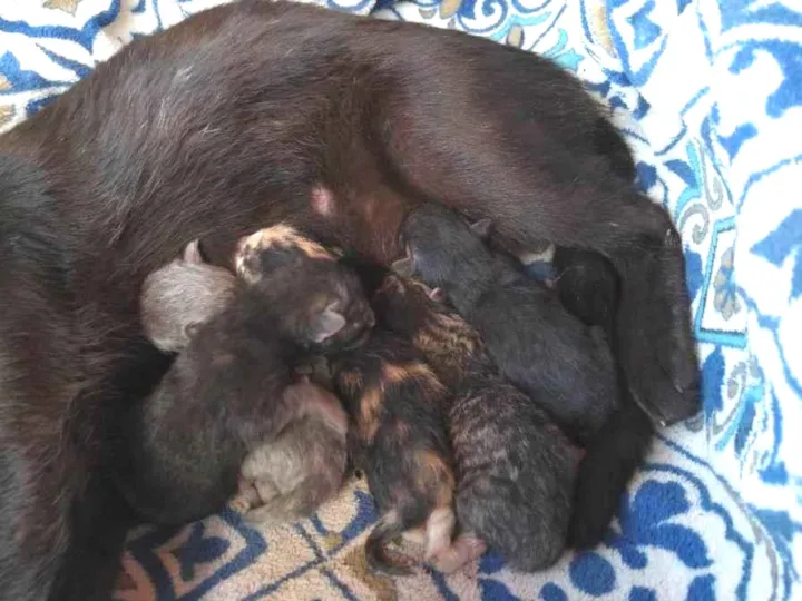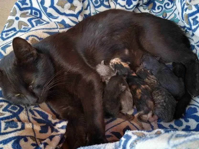 Uma Gata de Rua deu ninhada em nosso pátio.. Seria a Gata e 5Filhotes recém nascidos.