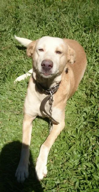 Cadela de pelagem creme, olhos cinza claro, porte grande. Foi abandonada na casa da minha avó há cerca de dois anos (por isso apenas estimamos a idade dela) e ela a adotou. Agora, porém, minha avó não tem mais condições de cuidar dela. A Branca é bastante útil como guarda, é brava com estranhos que se aproximam da casa. Não é castrada.