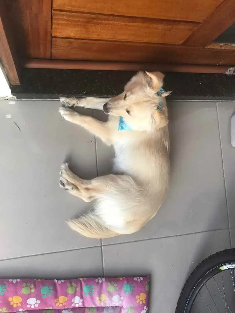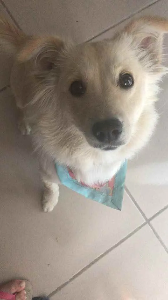 Tem 11 meses, porte M e pelagem mesclada na cor branca e bege.
