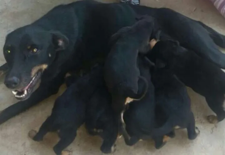 Ela é uma cachorrinha preta de pelo ralo bem dócil, apareceu grávida na minha rua, cuidei dela é doei os filhotes, mas não posso ficar com ela pois já tenho os meus. Convive bem com crianças.