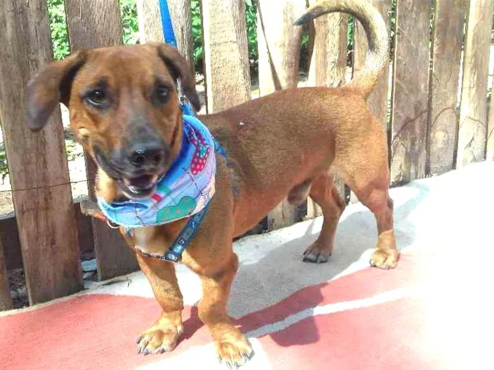 Macho. Porte Médio (uns 15kg). O corpinho lembra um basset, é comprido, rebaixadinho e entroncadinho.