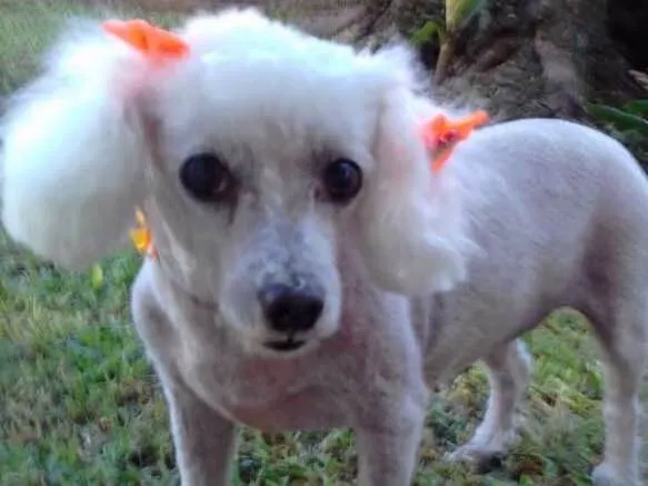 Branca ,pêlo tosado,unhas pintadas vermelho,não tem duas tetas (motivo cirurgia ) castrada,muito dócil! Ganha ataque epilético. Já está velinha tem 10 anos ! É a cachorrinha da minha mãe desde quando nasceu,são inseparaveis!