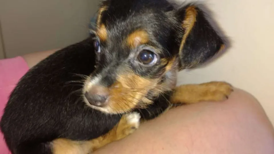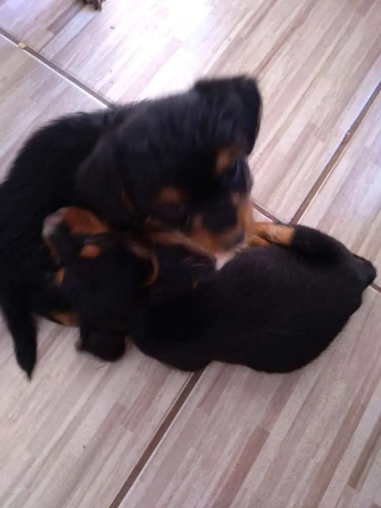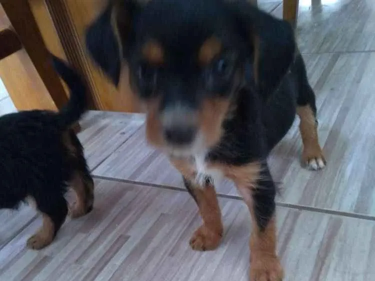 Filhote fêmea de 1 mês e meio. Pai York Shire e mãe vira-lata de porte pequeno (aparece nas imagens).