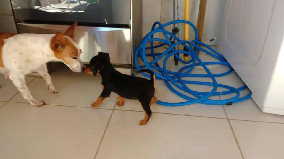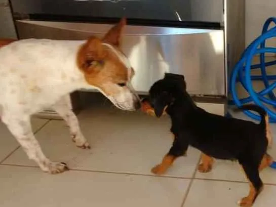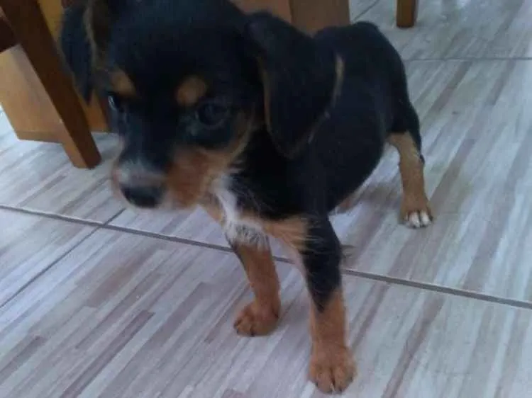 Já come ração amassadinha. Pelo médio preto com manchas marrons. Muito brincalhona e esperta.
