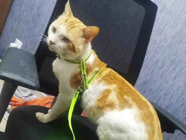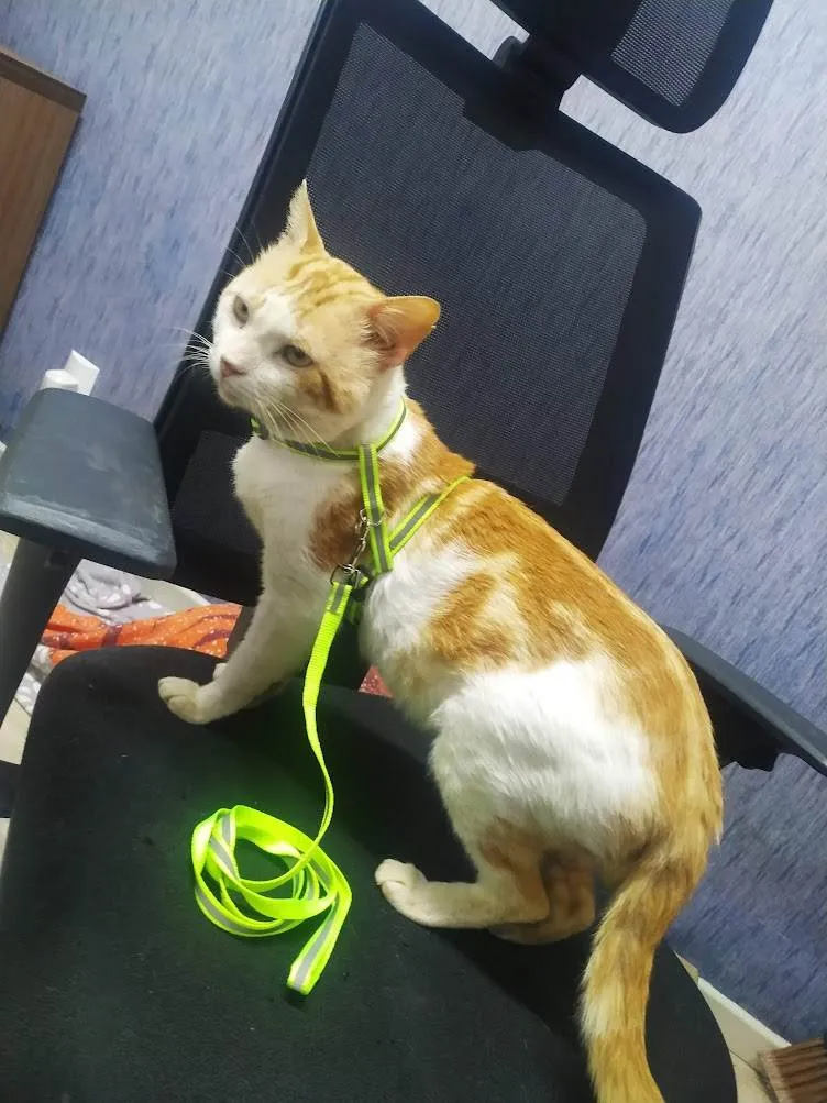Gatinho de pelo branco mesclado com laranja. Em torno de 2 anos de idade.