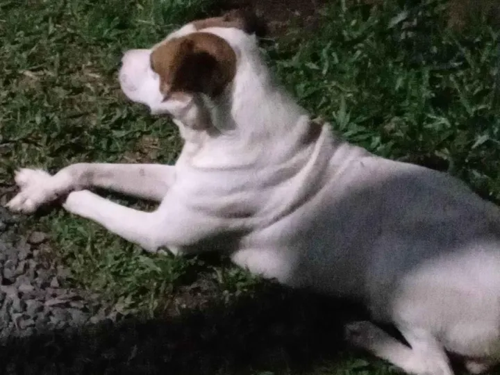 de pelo branco com marrom/bege. Ele é grande e muito amigável, normalmente ele obedece e sempre quando quer algo ele dá sinais. Gosto muito do Bred, porém não tem mais como eu ficar com ele.