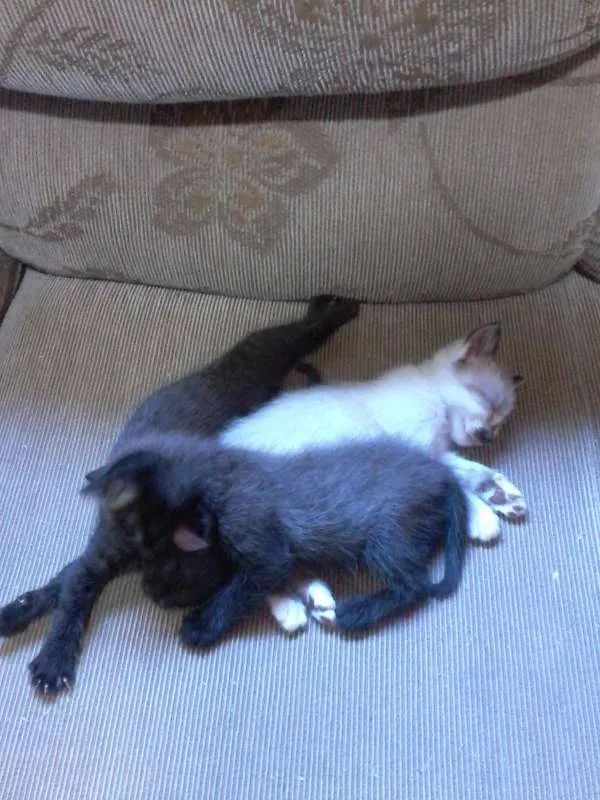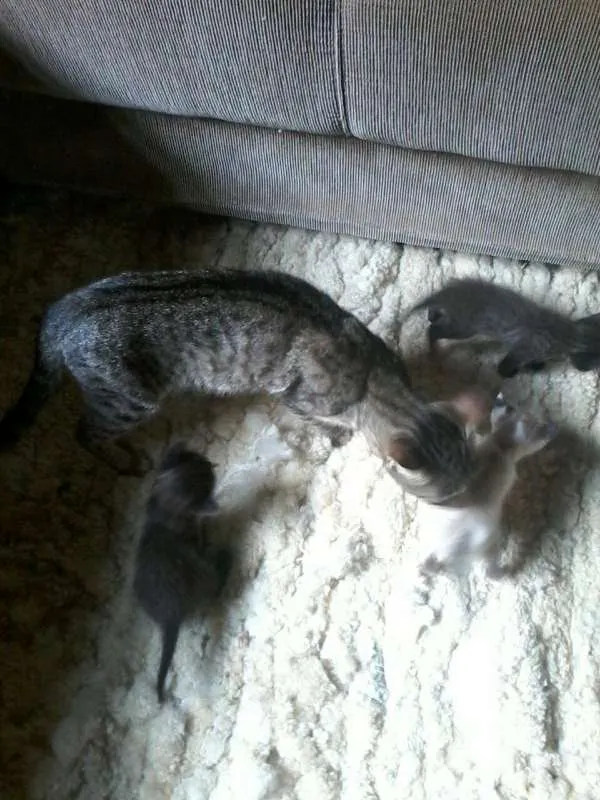 O gatinho Branco já encontrou um lar, ainda estão disponíveis o preto (fêmea) e o cinza (macho) e a mãezinha