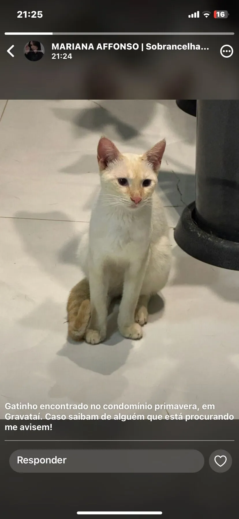 Encontramos um gato macho, chamado Nn, perdido no bairro Jansen. Ele é um SRD-ViraLata com pelagem branca, tem apenas 1 ano e é de porte pequeno. Nn é um gatinho dócil, calmo e extremamente sociável. Ele se dá bem com outros gatos, cachorros e até mesmo com crianças e desconhecidos, o que o torna um companheiro ideal para qualquer lar.
