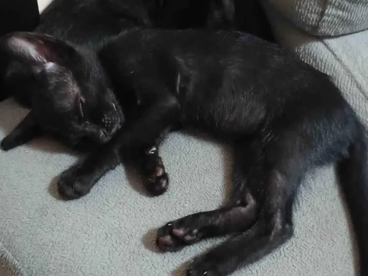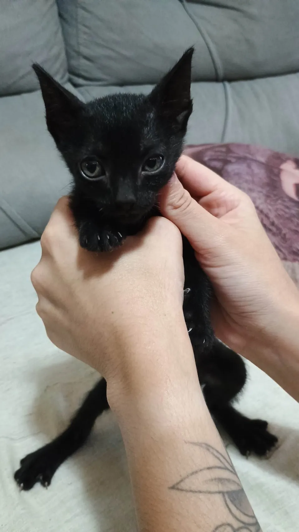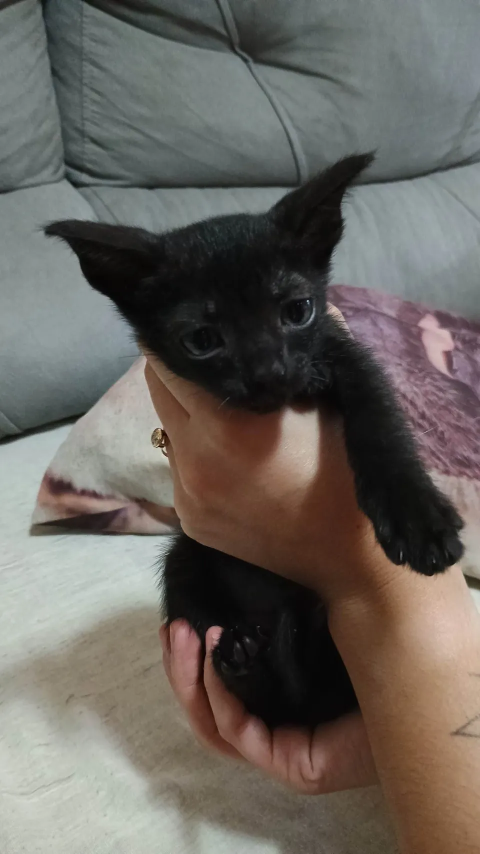 Você está em busca de um novo amigo para alegrar seu dia a dia? Conheça nosso adorável gatinho SRD, com pelagem preta brilhante e menos de 2 meses de idade! Com porte médio, ele é a definição de doçura e alegria.