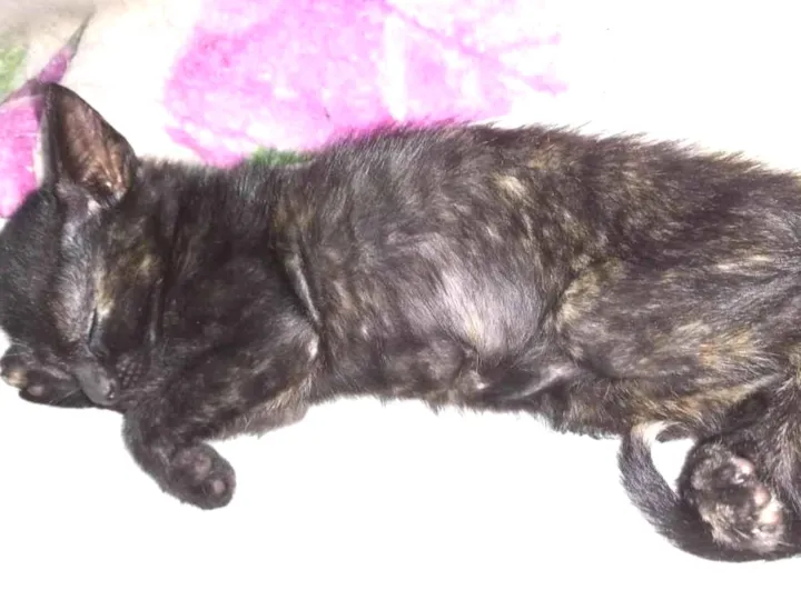 Gata fêmea pelo "escaminha" preta rajada de amarelo e branco, ponta do rabo branco. 2 meses, come ração e usa a caixinha de areia. Tomou 2 doses de vermifugo. Muito saudável e ativa!