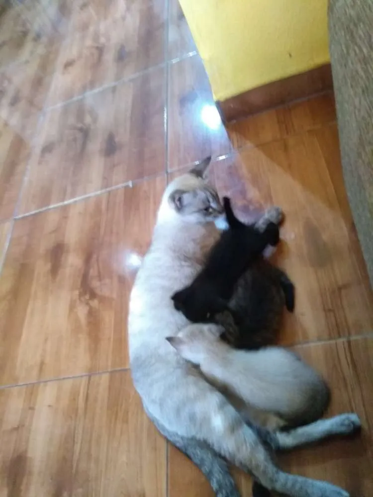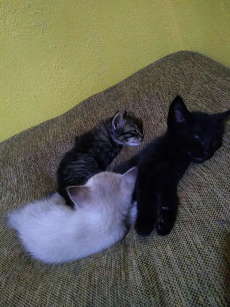 3 gatinhos para adoção responsável,1 machinho preto,1 machinho mesclado e 1 fêmea branca.Nasceram dia 10/03/19, fazem 2 meses amanhã, já comem ração e usam a caixinha de areia .