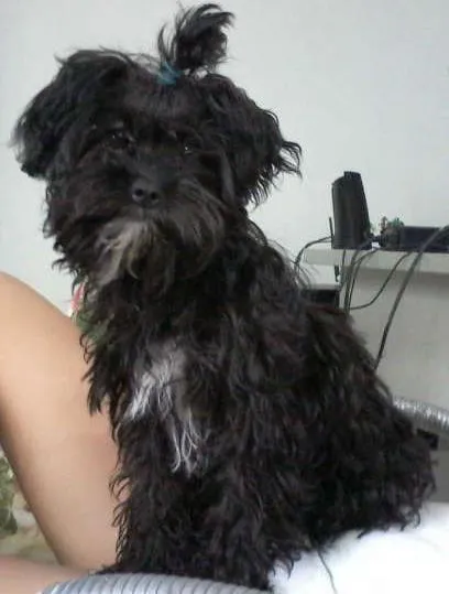 É uma mistura de pincher com poodle, tem um aninho e atende pelo nome Mya, apelido Mix.