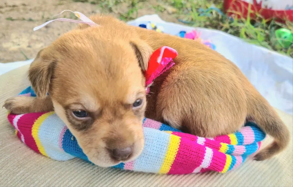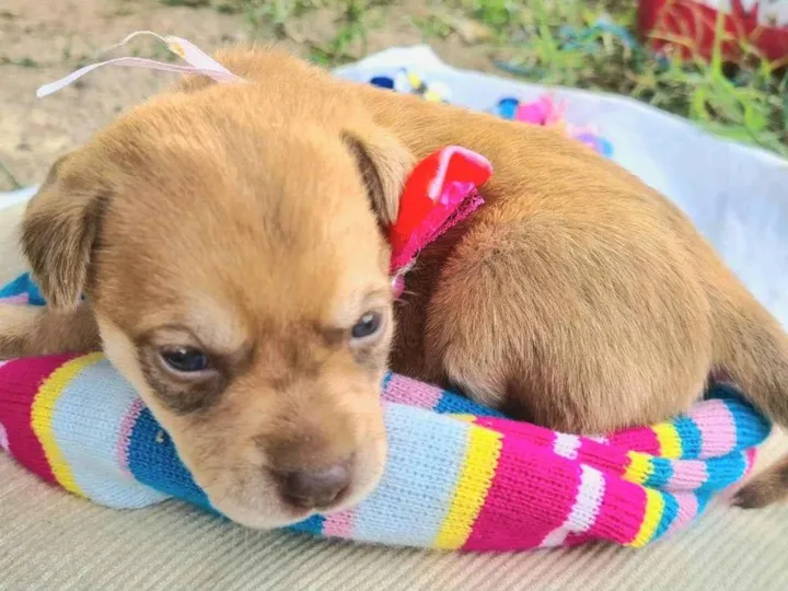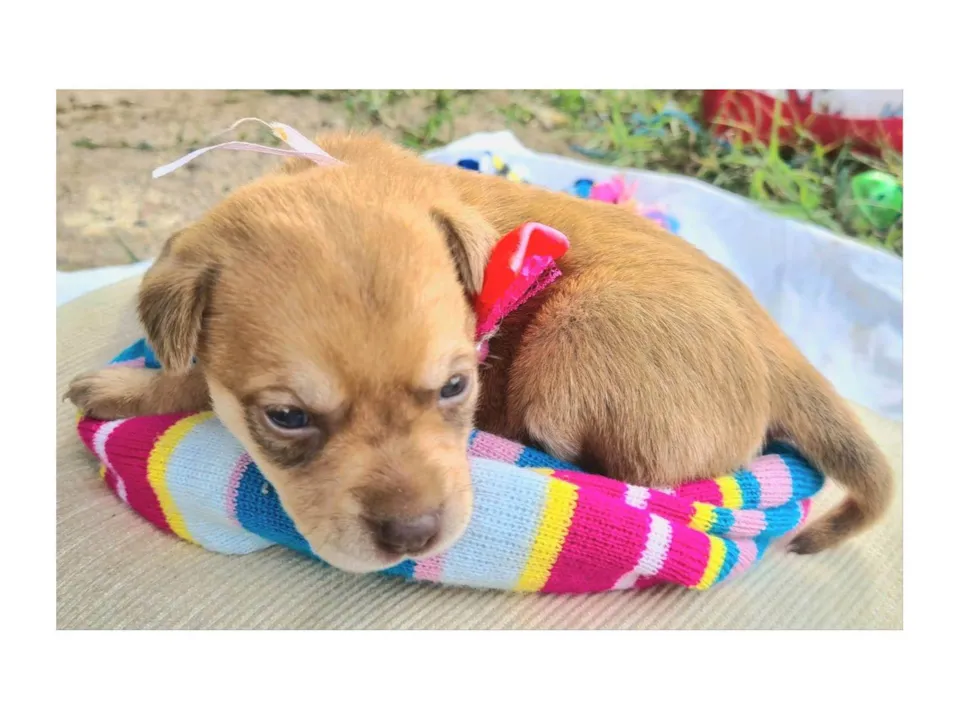 Barbie, femea em torno de 30 dias ou um pouco mais, na~o temos certeza do tamanho, a mae eh porte P, mas pai eh desconhecido.Sera doado para patio bem fechado sem risco de fugas e livre de correntes. Vacina por conta do adotante, entrevista com questionario e termo de adocao responsavel. Contato com Rose 51991436359