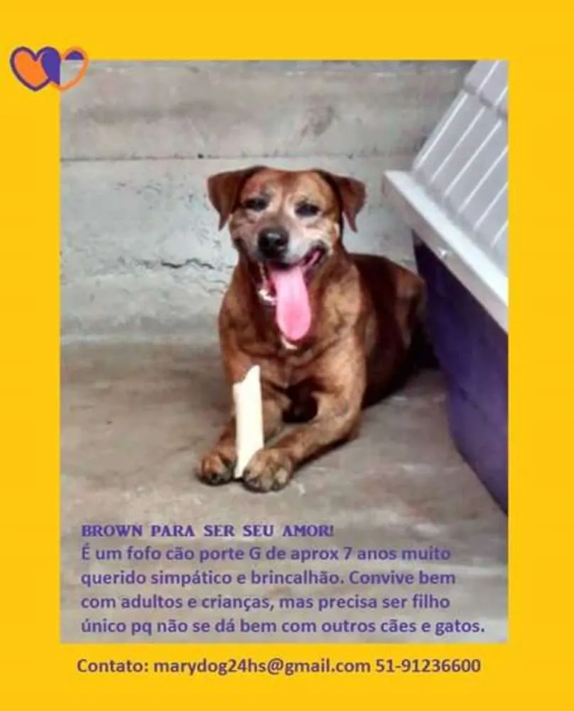 Brown, é um lindo cão adulto que ainda não conseguiu uma família de raça para adotá-lo. Está aguardando adoção há quase 3 anos....Tem em torno de 7/8 anos, está castrado, desverminado e vacinado. Ele é um amor de caramelo e merece ser feliz, receber carinho e ter um bom pátio para cuidar e brincar muito! Adora humanos, porém, deverá ser filho único pois é territorialista e também não se dá com gatos. Deverá ficar solto no pátio, não será doado para viver acorrentado.