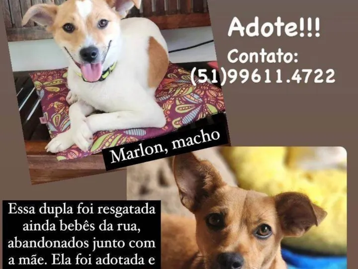 Marlon e Kiki são irmãos e muito amigos. Eles tem 09 meses de vida e estão castrados. Pesam 10 kg Tem porte pequeno para médio. Eles são caezinhos muito meigos, queridos e carinhosos. Eles passaram por dificuldades juntos e isso fortaleceu ainda mais a amizade deles. Então seria um ato de amor, serem adotados juntinhos. Eles são muito carentes e carinhosos, adoram ficar perto das pessoas.Precisam muito conhecer a paz, a tranquilidade, a segurança e o amor de viver em uma família.