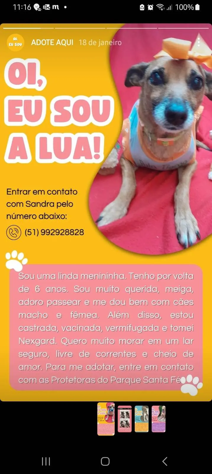 Lua é uma cadelinha amigável e carinhosa, castrada e vermifugada, está em lar temporário esperando uma família só sua para demonstrar toda a sua gratidão! Para lares sem risco de fugas e livre de correntes. Contato com Cristiane 51 995040238 para entrevista de adoção e assinatura de termo de responsabilidade.