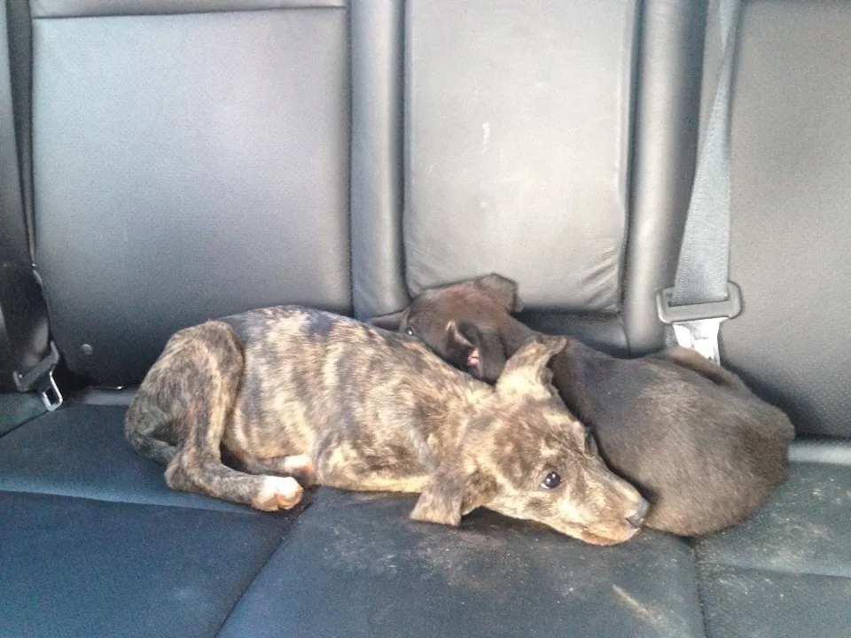 Nós somos o Charlie Brown (macho; preto) e a Penny Lane (fêmea; tigrada)! Fomos resgatados (dia 21 de julho) pela tia Camilla. Quando ela nos encontrou, estávamos no acostamento de uma estrada, tentando comer a carniça de um cão que tinha sido atropelado. Chovia e fazia frio. Então a tia nos salvou!