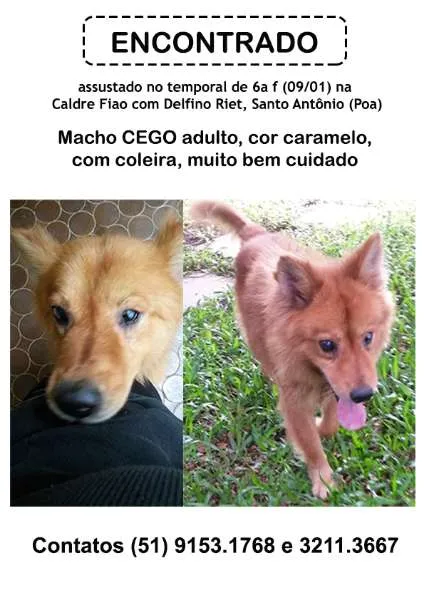 Olá pessoal, escrevo na expectativa de ajudarem nesta situação especial: encontramos na última sexta (09/01), no Bairro Santo Antônio/ Porto Alegre, na Caldre Fião com Delfino Riet, assustado no meio do temporal, cachorro CEGO adulto (não velho), cor caramelo, porte médio, com COLEIRA.