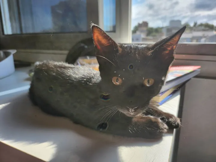 Dizem que sou a única fêmea da ninhada da Misk, mas honestamente? Acho que sou parente distante da Pantera Cor-de-Rosa... compare as nossas caras! Certamente sou uma prima distante....Sou quietinha, prefiro ficar na minha, mas sou meiga. Curto um colo eventual, caçar moscas e meu esporte predileto é futebol de tampinha!