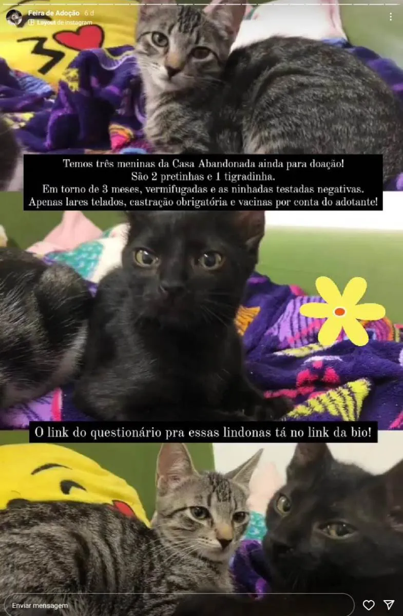 Algumas gatinhas viviam em uma casa abandonada, pois sua tutora faleceu... algumas voluntárias começaram a cuidar da situação e retirá-las de lá, castrar e duas ninhadas nasceram nesse meio tempo. Conseguimos lar temporário e faltam apenas essas três meninas para serem adotadas. Se você já tiver um gatinho em casa ele deverá ser fiv/felv negativo.