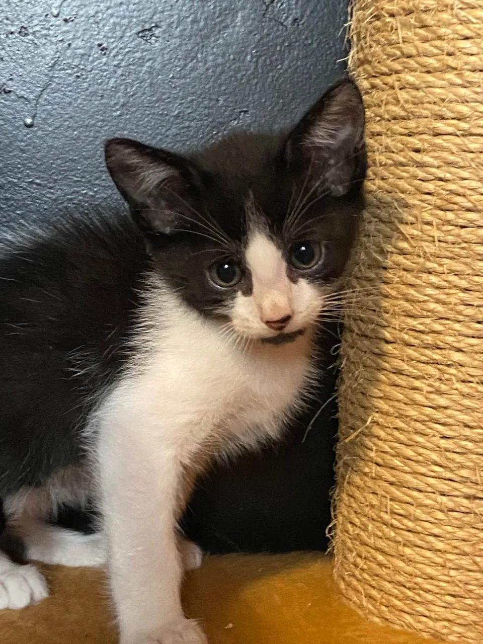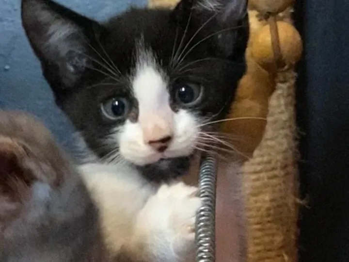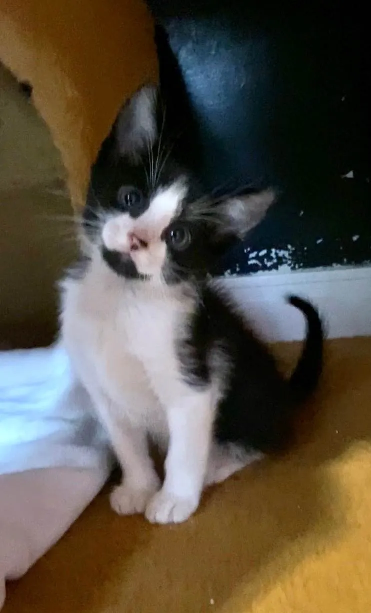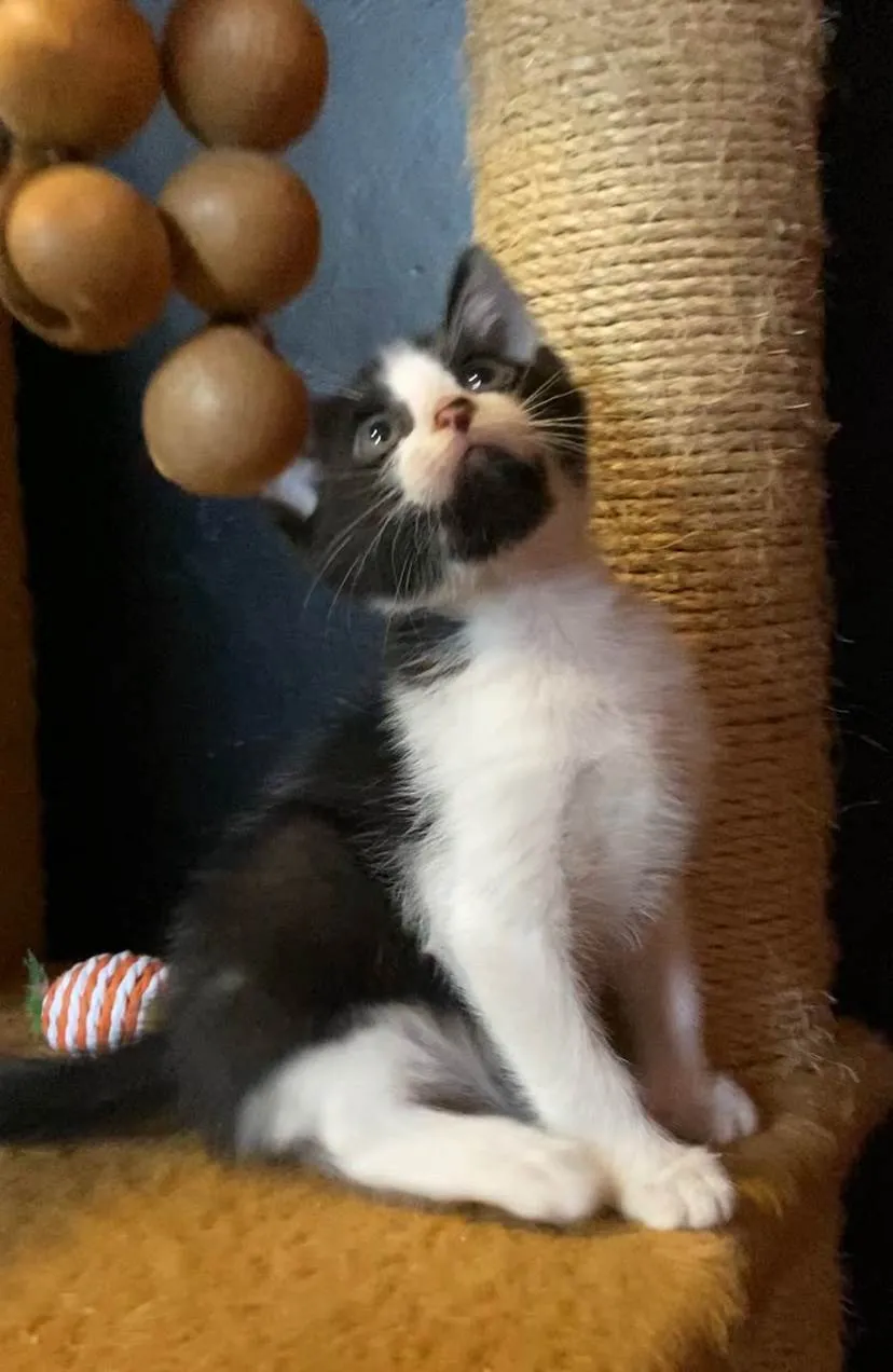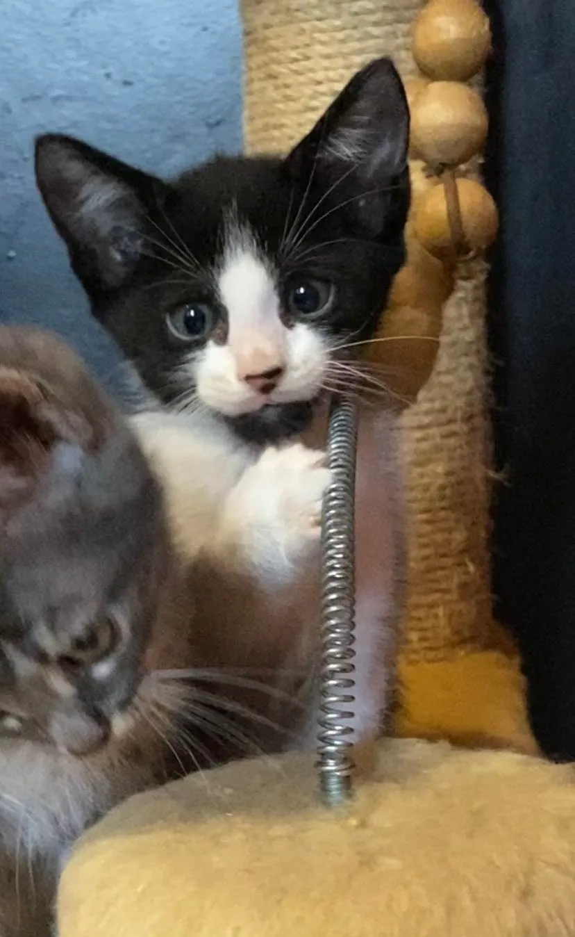 Indispensável telas de segurança nas janelas. Está com 45 dias, comendo ração e sachê, usando caixinha de areia. Mãezinha negativa fiv felv. Teste, vacinas e castração por conta do adotante.