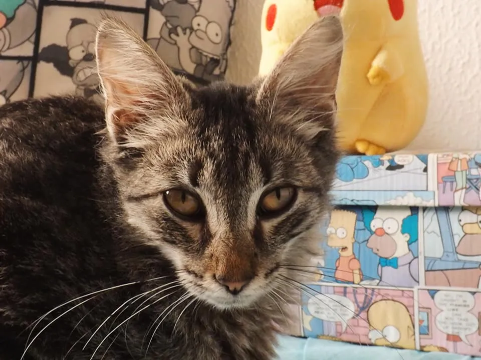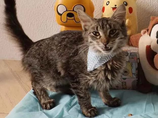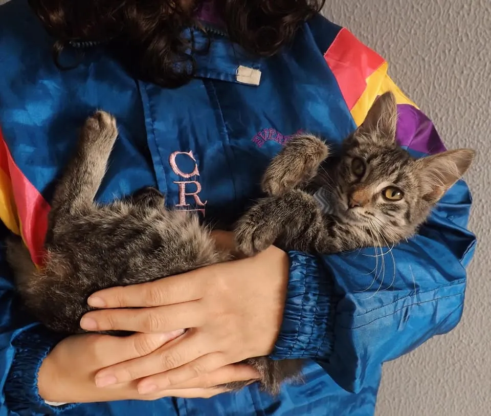 Tem aproximadamente 3 meses, usa a caixa de areia e come ração.