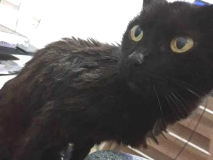 ”Encontrei ela alguns dias atrás na rua comendo lixo.Ela estava comendo lixo,não miava,não tinha reflexos de medo e estava magra.Já estou com ela há alguns dias mas não tenho como cuidar pois já tenho gata em casa e o lugar não é grande.Se algm quiser adotar,esteja ciente da situação dela”