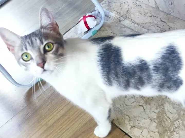 Ela é uma gata de porte pequeno-médio, com pelagem branca e cinza. Tem olhos verdes e um belo sorriso.