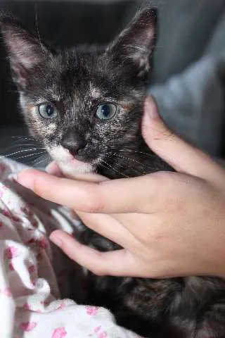 Esta gatinha tem 1 mês e meio, já sabe comer ração e usar a caixinha de areia.