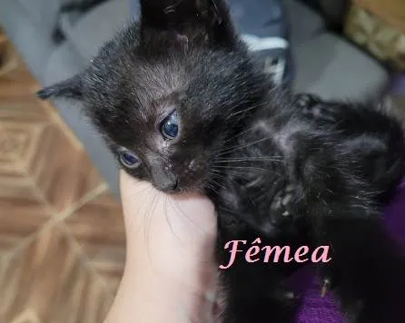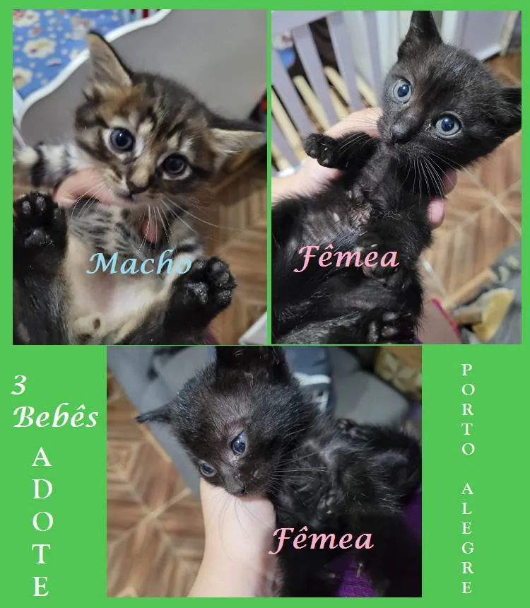 TRÊS BEBÊS - 50 dias, desverminados, tratados para pulgas. Um macho tigrado, e duas fêmeas pretinhas. Lembrando que o futuro adotante deverá se responsabilizar pela CASTRAÇÃO OBRIGATÓRIA, no tempo certo, vacinas e teste. Serão entregues para LARES TELADOS e SEGUROS, sem rotas de fuga.