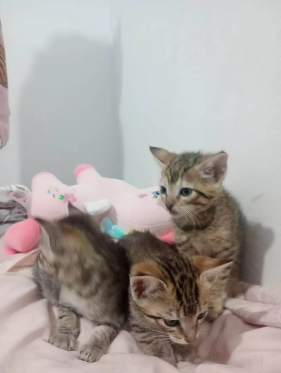 Tenho 4 gatos para adoção, 3 gatinhos tem 1 mês e 15 dias (pelagem tigrada)1 gata de 8 meses não castrada (pelagem preta)