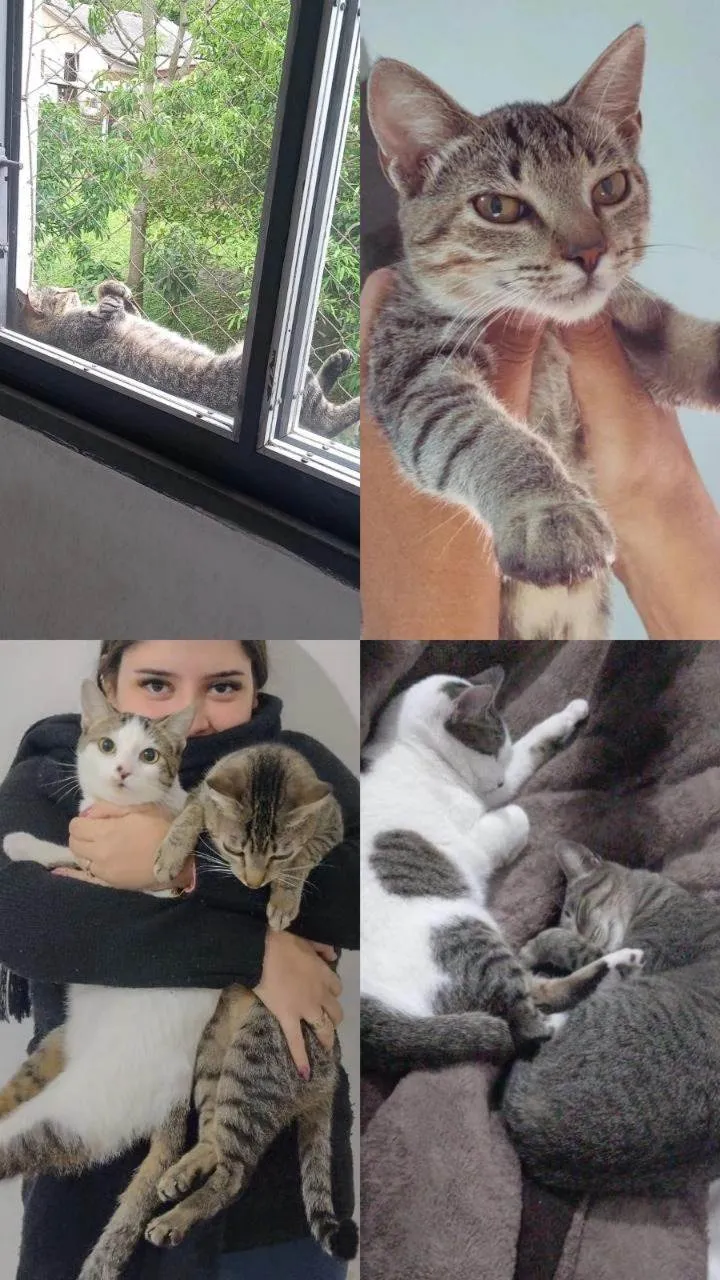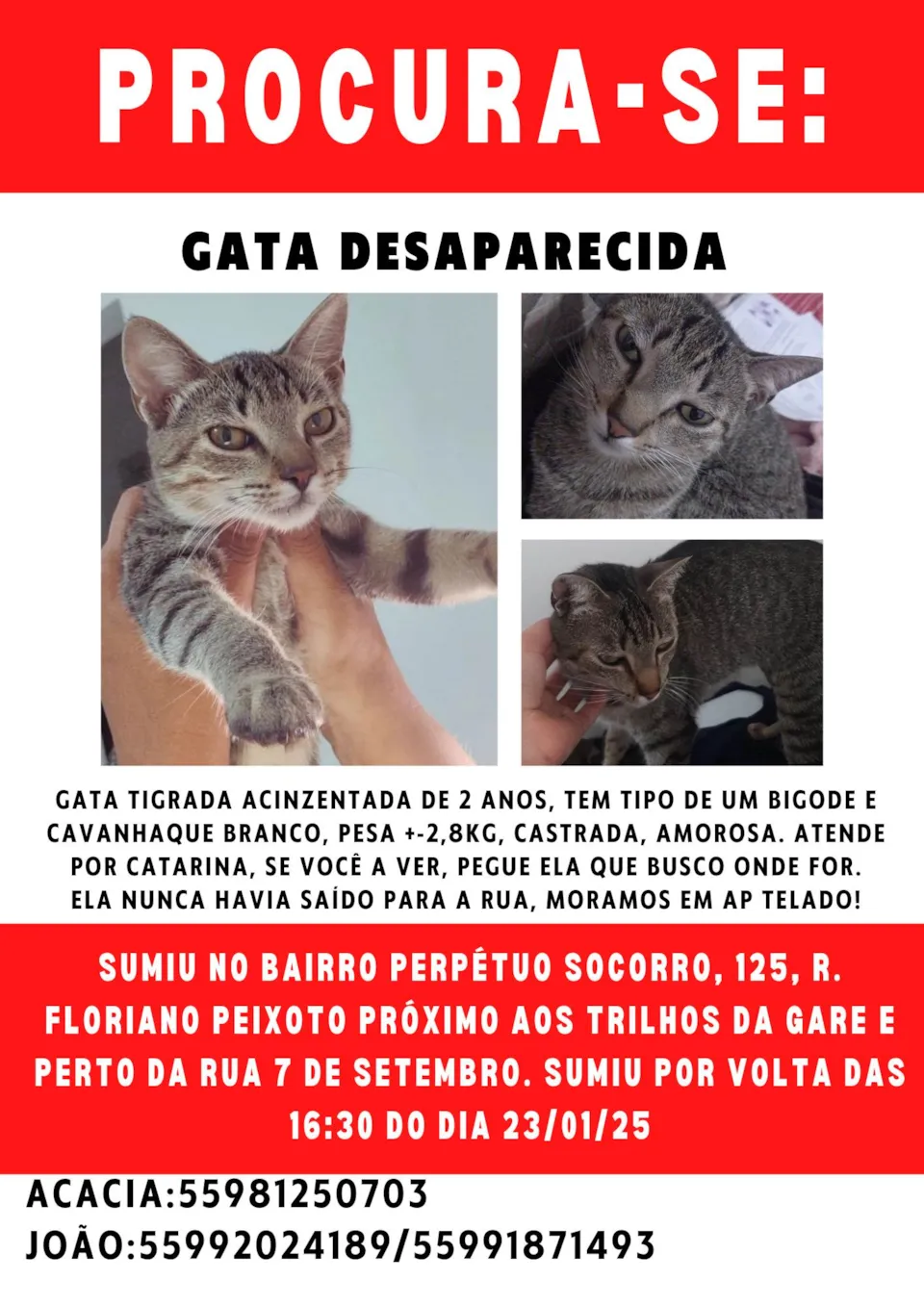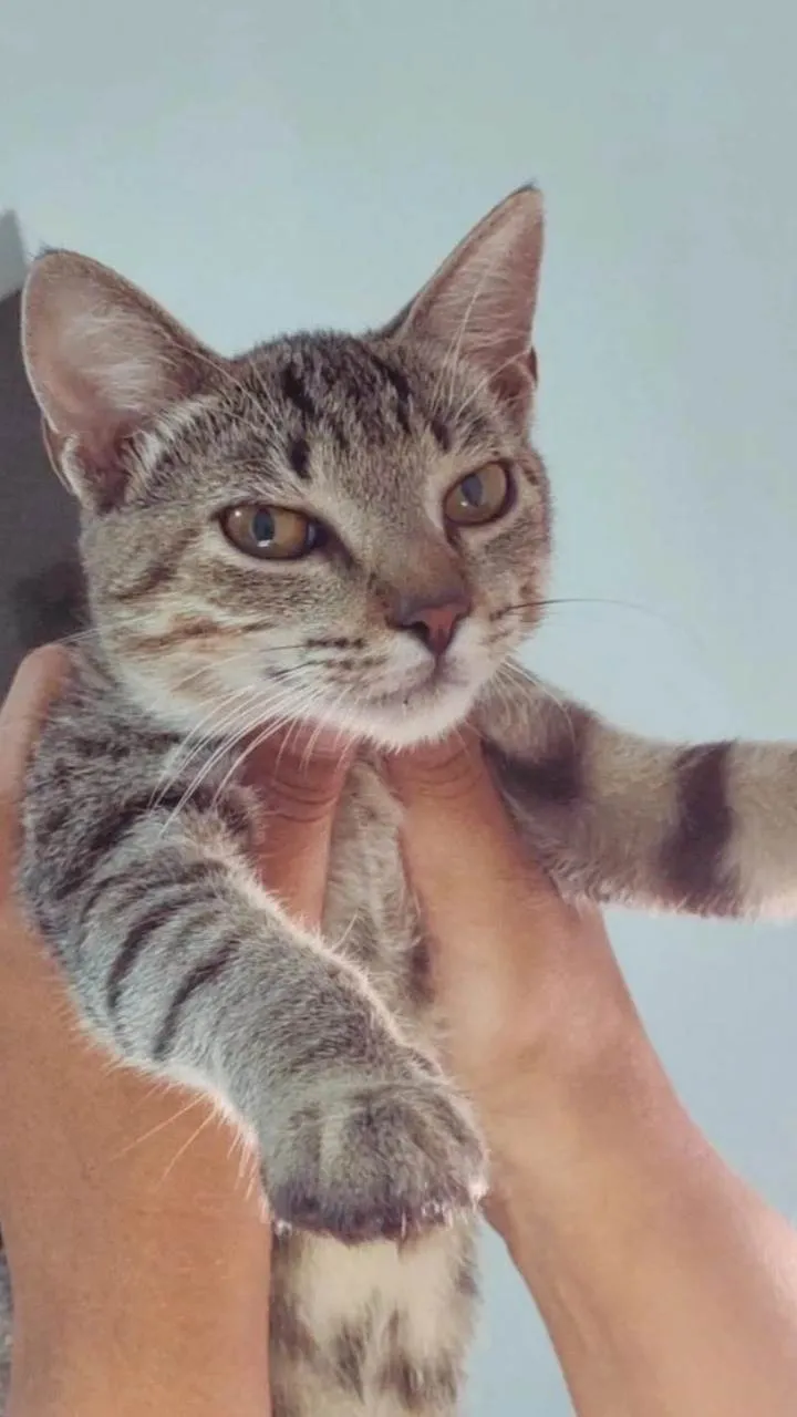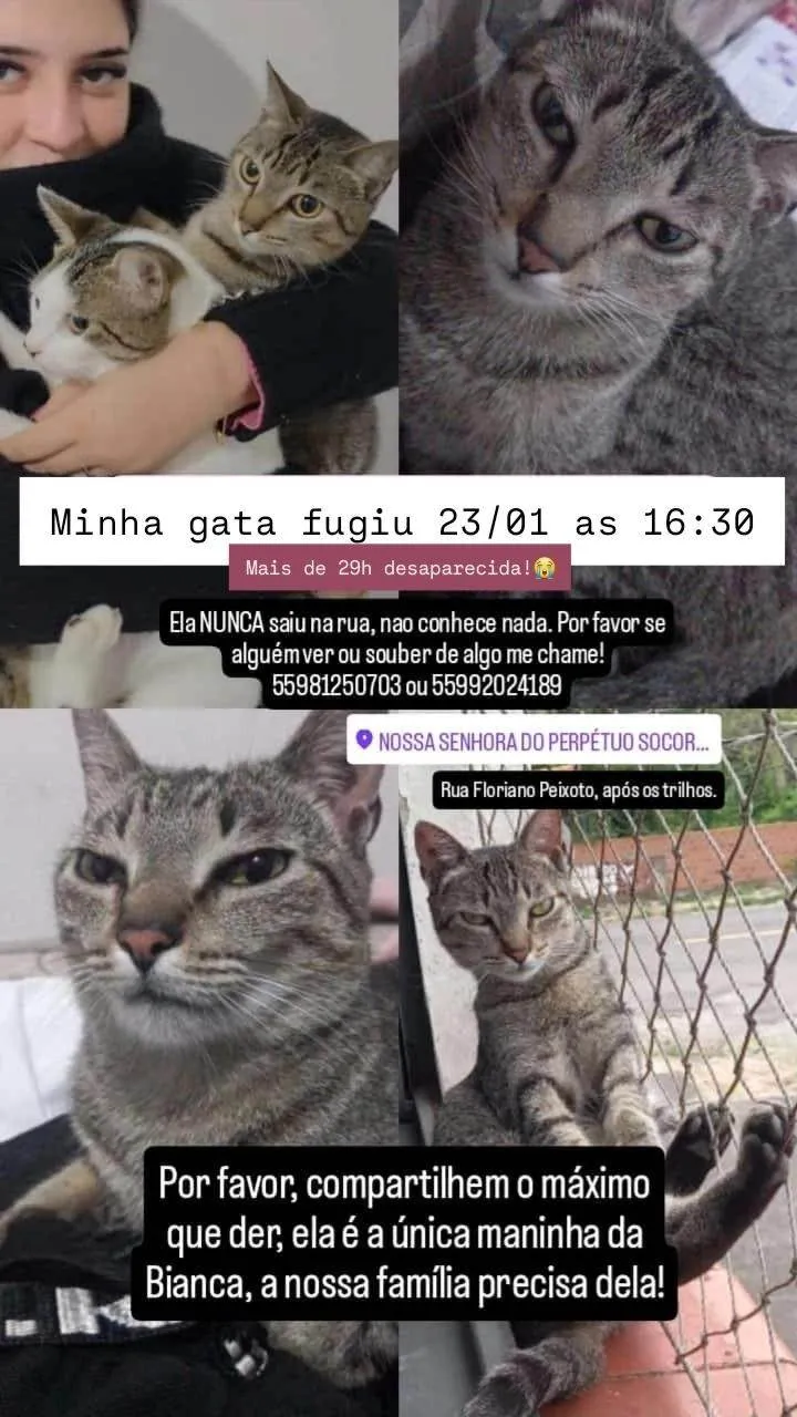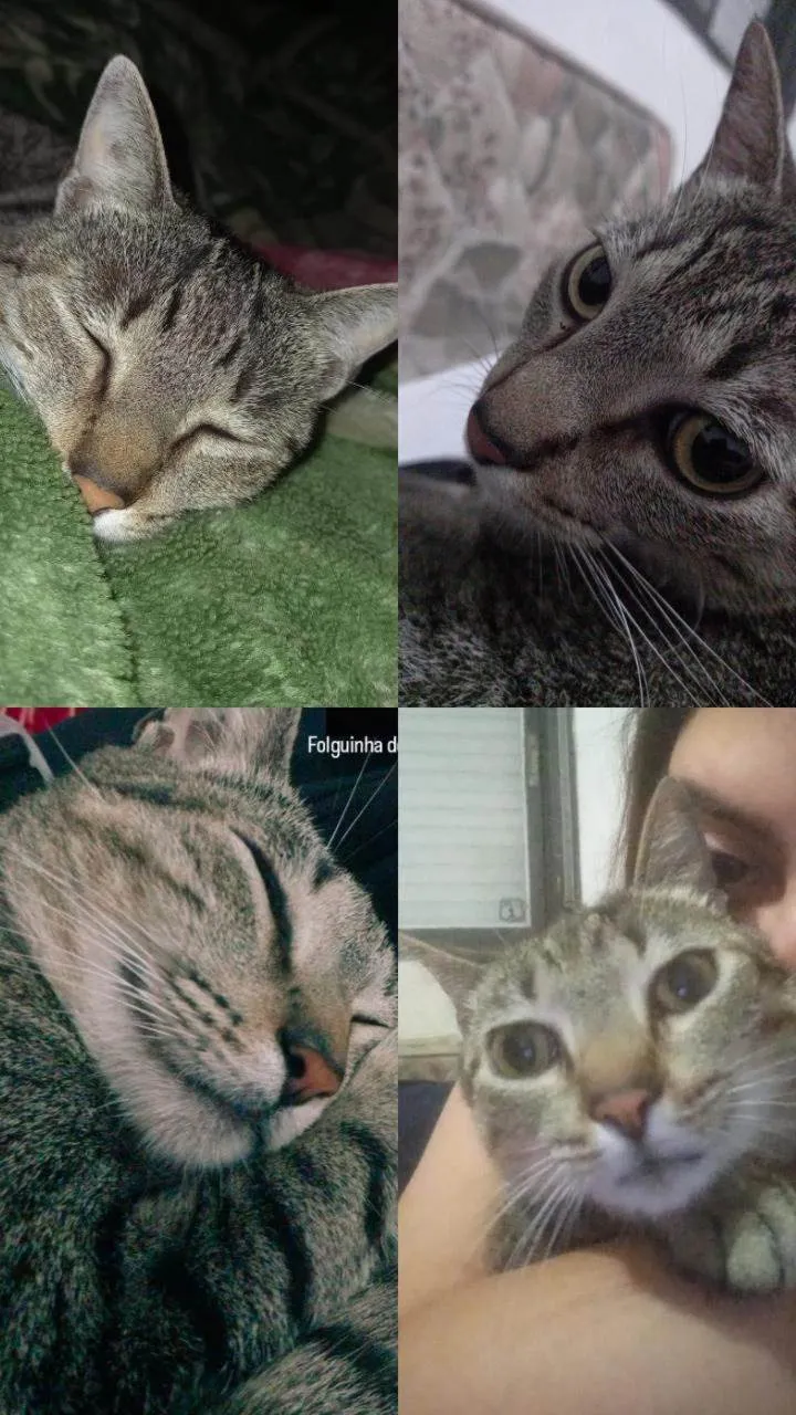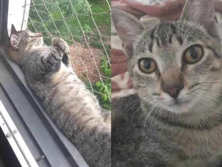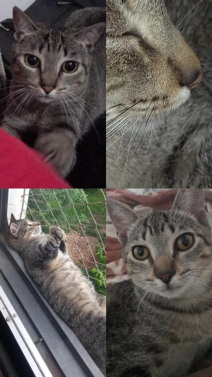 Castrada, gata tigrada puxando para tons cinzas, alguns detalhes amarelos também. Ela tem 2 anos, muito carinhosa fica sempre fazendo pãozinho até caminhando. Ela tem focinho laranja e tipo de duas guampas na testa perto dos olhos. Miado fino. Corpo dela comprido com pelagem média, e quando fugiu ou foi roubada estava sem pulgas, e com o pelo bem cuidado.