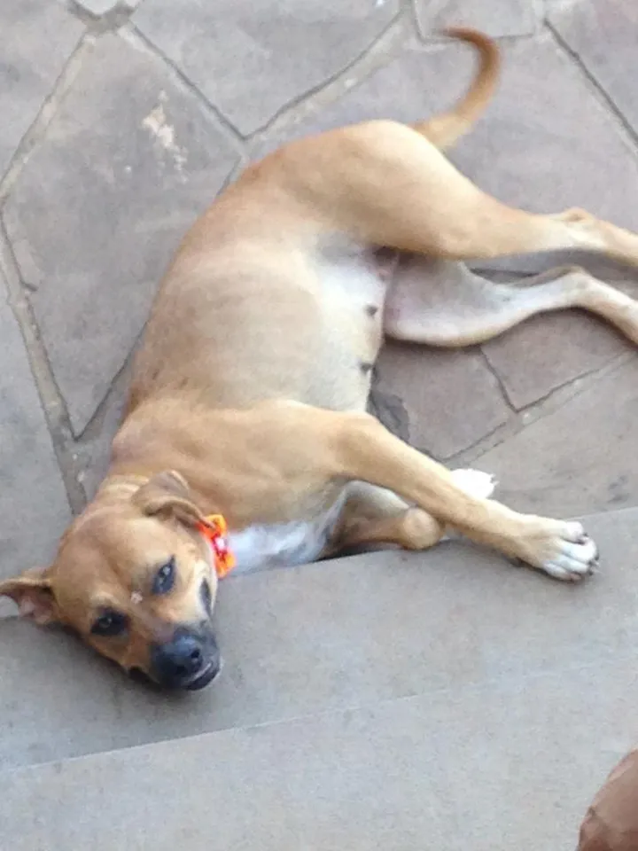Ela é lindona, de porte médio, a mãe dela é American staffordshire terrier, acredita-se que o pai é um fila, mas ela é muito mais parecida com a mãe.