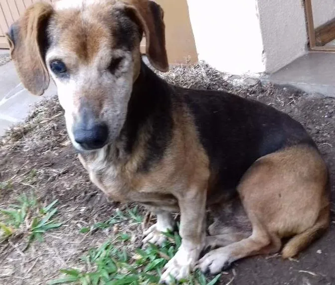 Parece ser um caozinho bastante velho, castrado, tem um olho cego, parece ser um animal que sofreu bastante, pois é muito assuntado, porém muito manso e amigável.