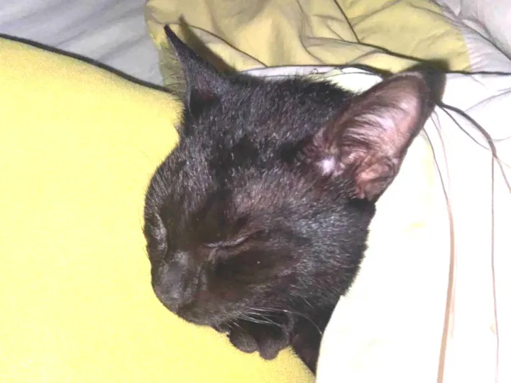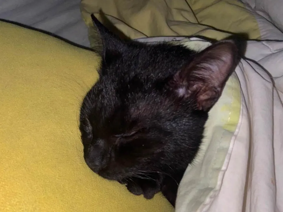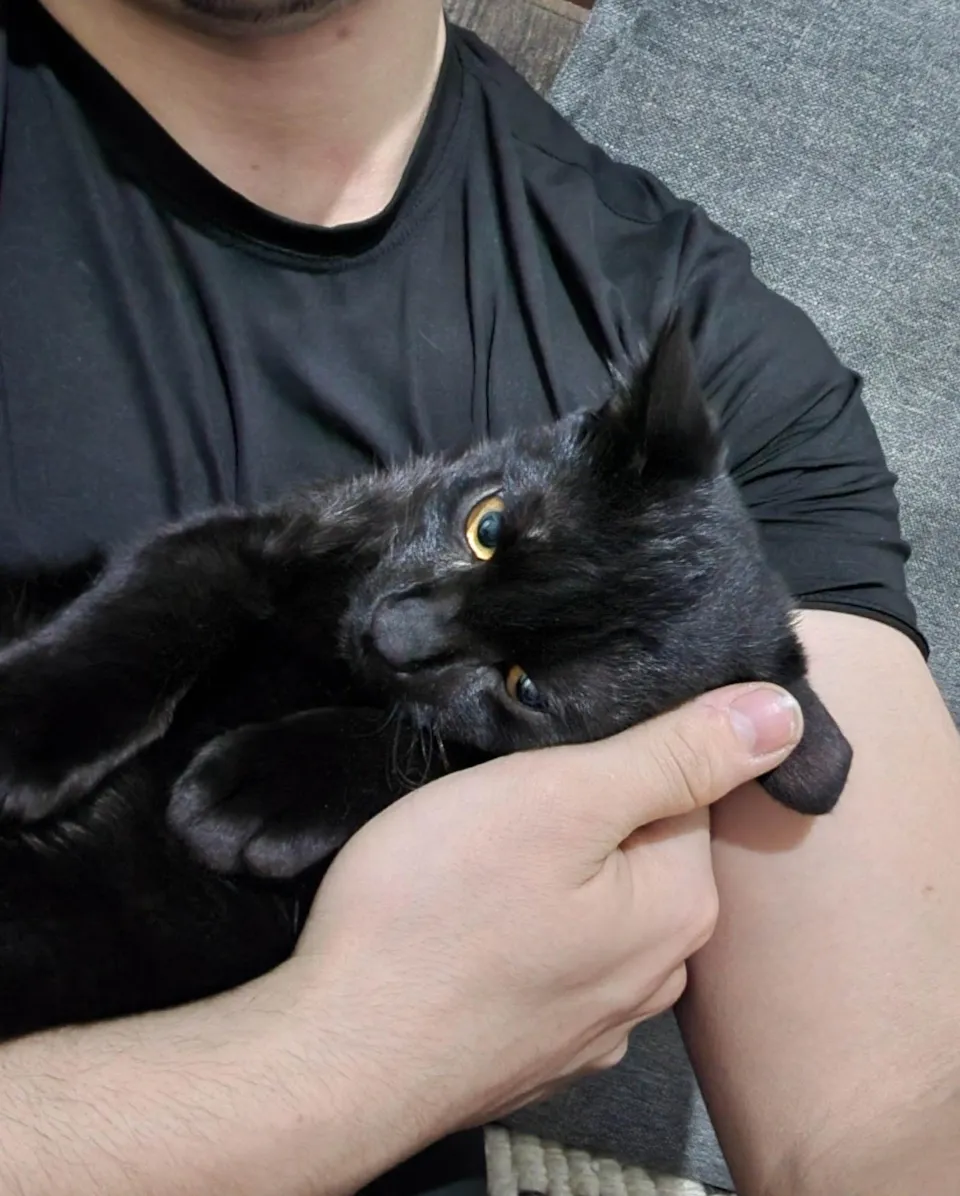 Desapareceu no bairro Santa Tereza – São Leopoldo. (Fugiu de casa.)• Cor: totalmente preto, com pouquíssimos fios brancos pelo corpo. • Pelagem: curta, lisa e bem brilhosa. • Olhos: grandes e amarelos intensos. • Idade: 7 meses (ainda não é do tamanho adulto). • Porte: médio/pequeno (filhote em crescimento). • Coleira: estava usando uma coleira xadrez amarela e laço azul. • Personalidade: muito manso e carinhoso, costuma dormir encolhido com as patinhas no rosto. • Saúde/aparência ao sumir: sem ferimentos, aparência saudável, não é castrado.