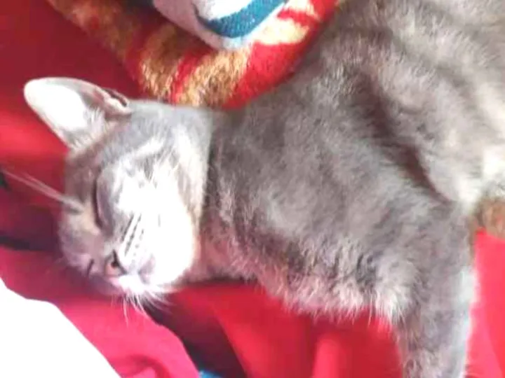 Ela não tem uma parte da patinha de trás e é cinza com os olhos verdes