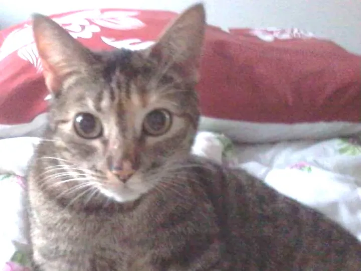 Esta gatinha tem o céu da boca preto e rosa, o nariz é cinza e rosa. O rabo na ponta é preto foi pisada e tem o rabinho com calo. É listrada cinza cinza escura. A carinha parece uma coruja. É castrada e tem uma barriga flácida