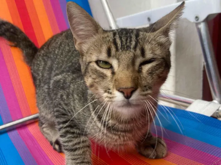 Animal encontrado: Gato macho sem nome, da raça SRD-ViraLata. Ele possui pelagem rajada e está na faixa etária de 2 a 6 meses. Este gato tem porte médio e apresenta um temperamento dócil, calmo e carente.