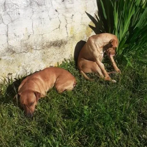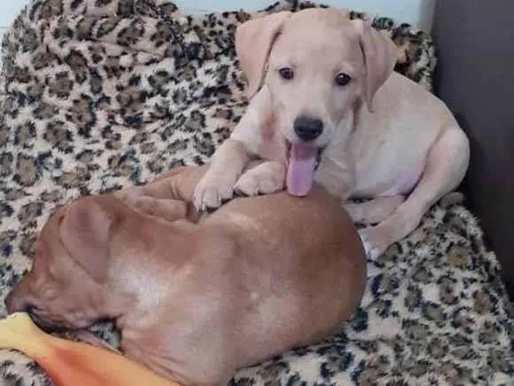 Porte médio, 2 anos e 5 meses, caramelo claro e caramelo escuro, ela é castrada e ambos vacinados com polivalente, temos as carteirinhas de vacinação.