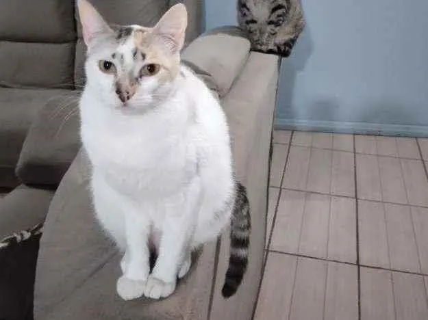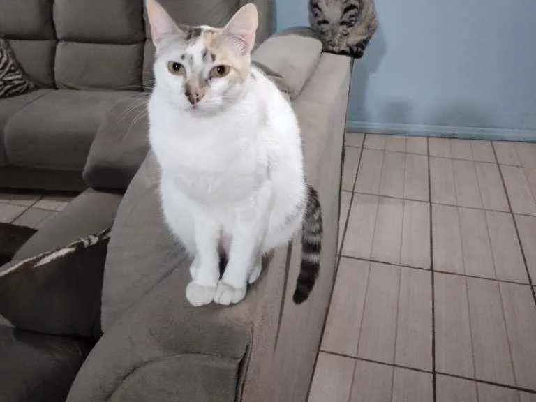 Aurora é branca com algumas manchas marrons e rabo preto