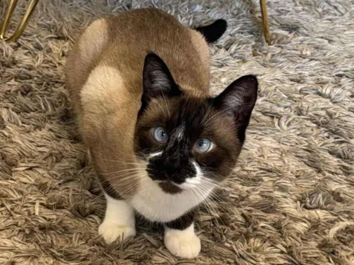 Olhos azuis e pelagem clara com face escura.