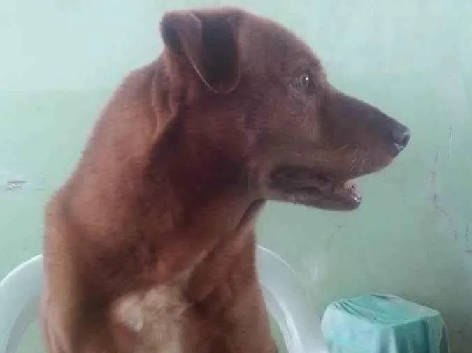 Cachorro porte médio, pelagem curta de cor caramelo escuro com mancha branca no peito,olhos claros(esverdeados), dócil, apesar da idade é bem crianção... Está na família desde bebezinho, já teve problemas de coluna pois tem uma hérnia na lombar pois gosta muito de pular pra deitar em cima da mesa do quintal... Estamos preocupados e sentindo muita a falta dele...