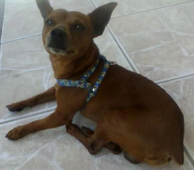 Pinscher médio, idoso e carinhoso, sumiu em 13/04/14 na rua Belo Horizonte, Blumenau. Tem problema de visão e alto valor sentimental. Recompensa por informações.