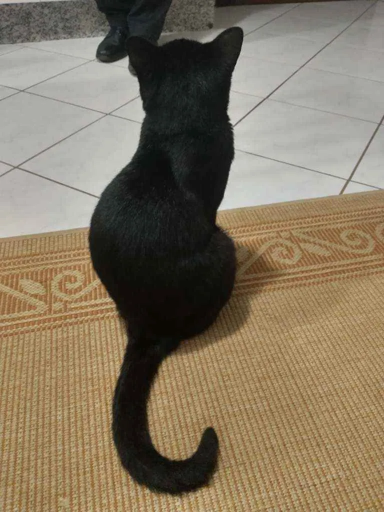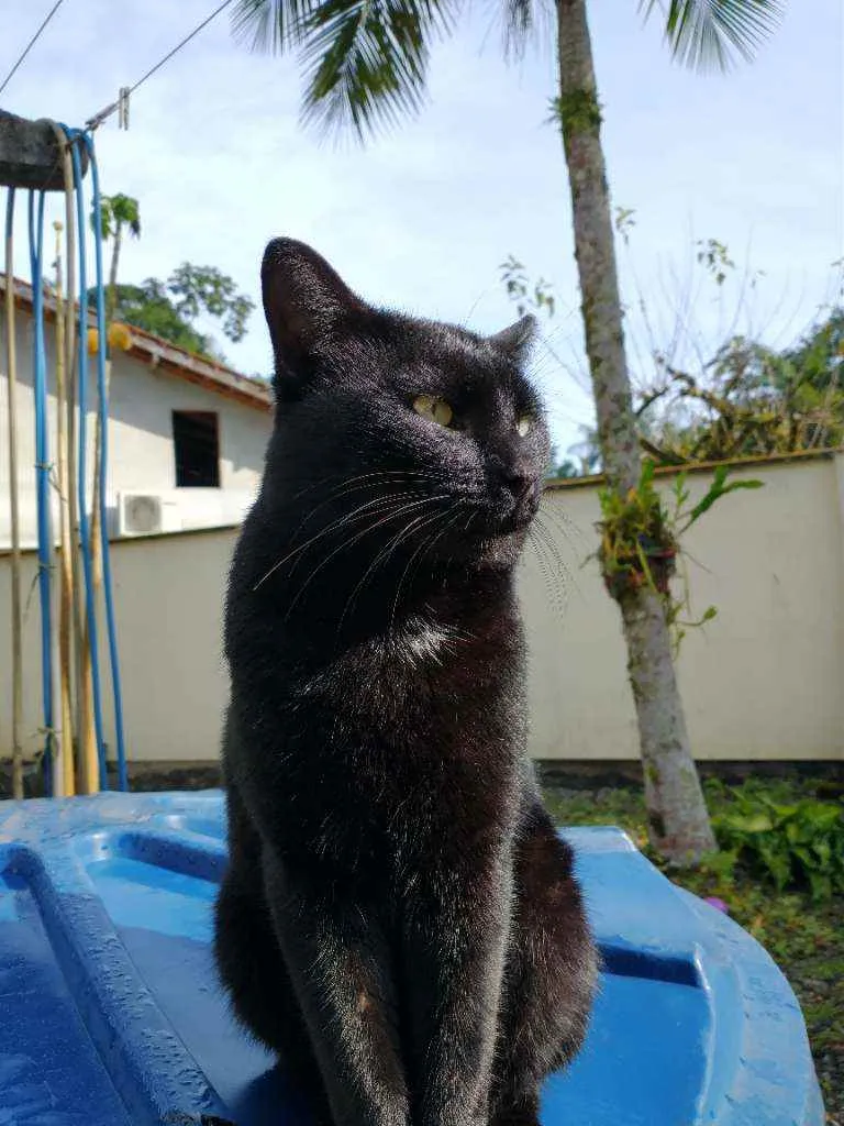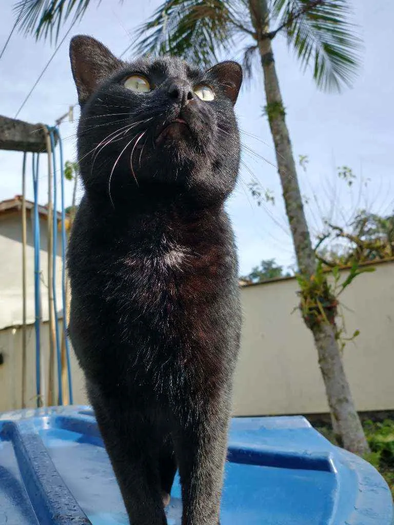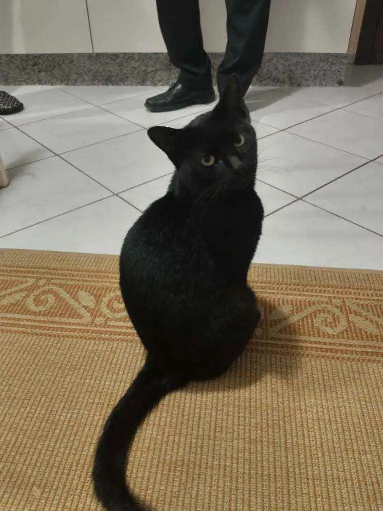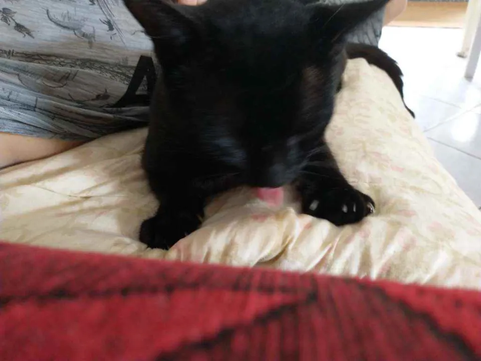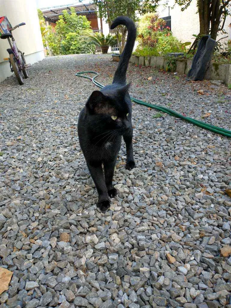 Gatito é um gato preto com uma pequena mancha branca no pescoço, ele é calmo e ama carinho, ultimamente ele tem brigado muito então tem machucados pelo corpo dele, recentemente ele perdeu o irmão e está sentindo sua falta, desde de que o barriguinha (irmão dele) sumiu ele mia o dia inteiro procurando ele.