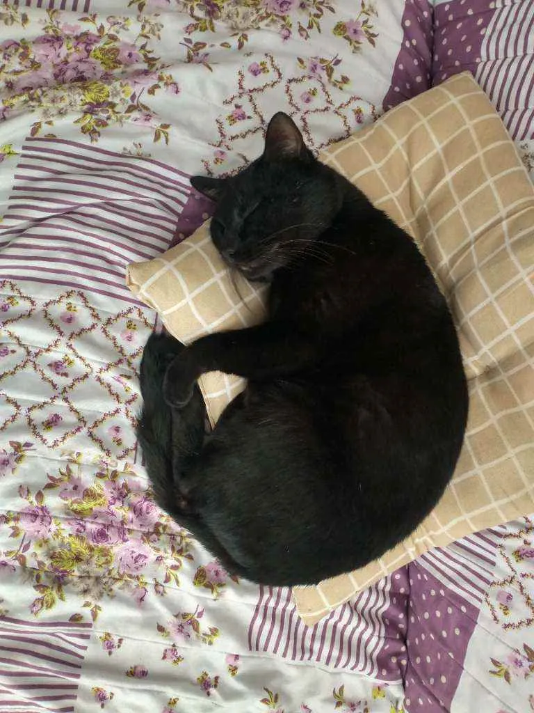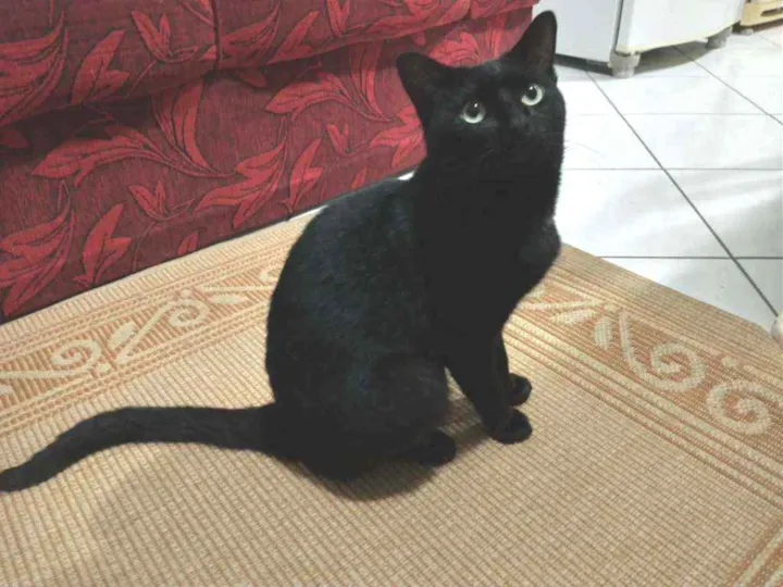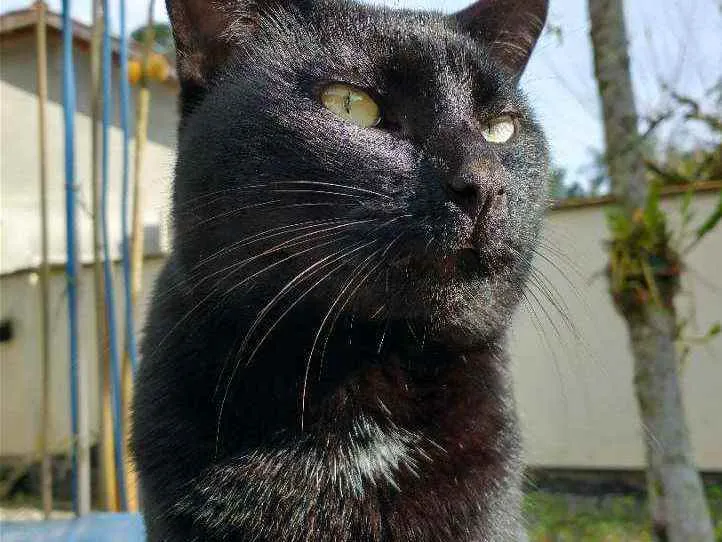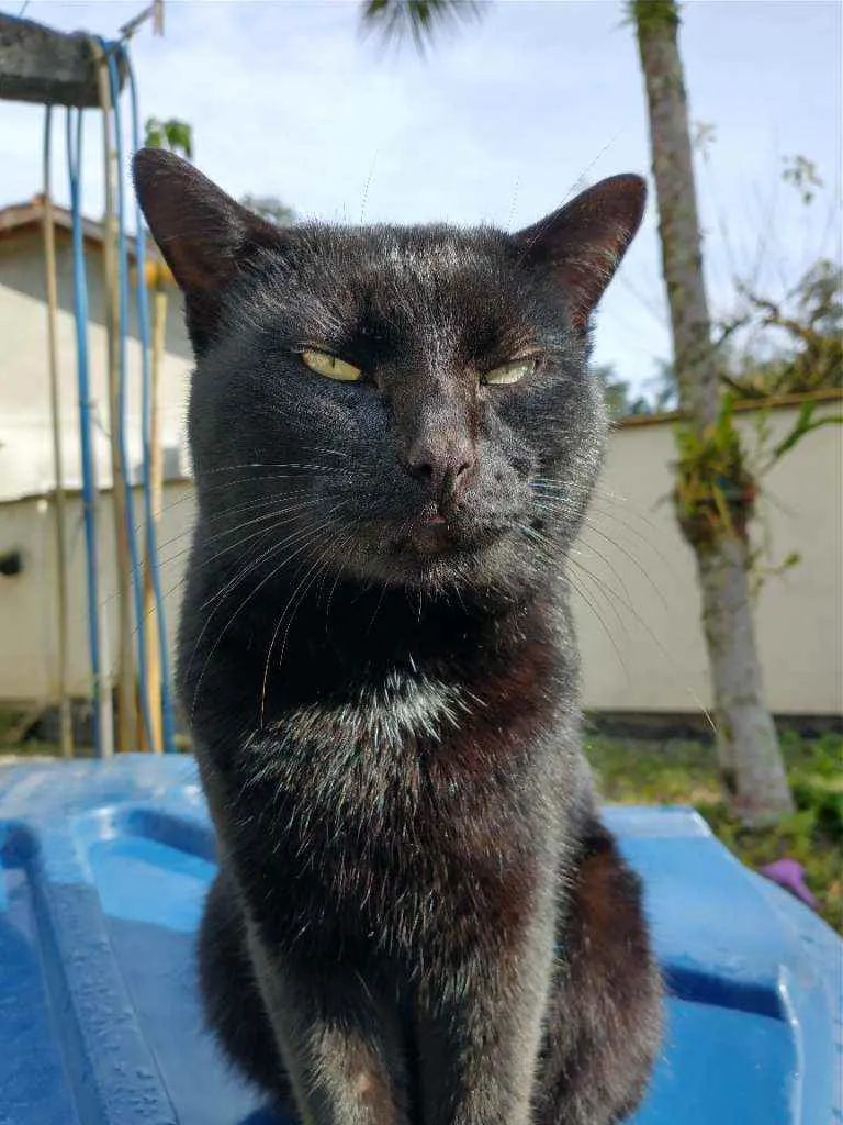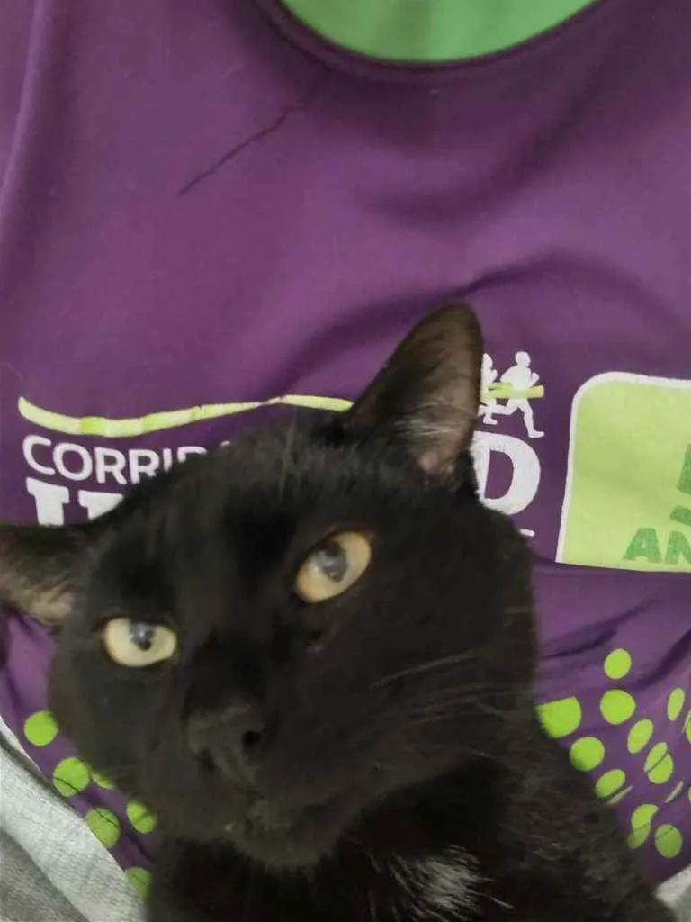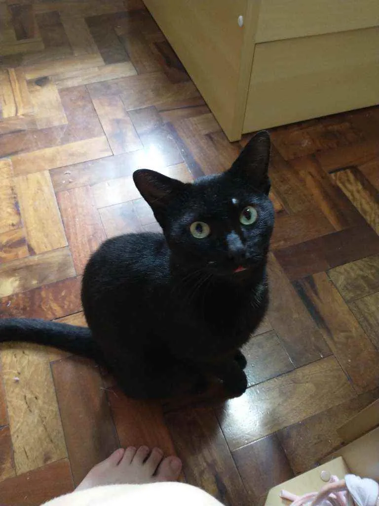 Gatito é um gato preto com uma pequena mancha branca no pescoço, ele é calmo e ama carinho, ultimamente ele tem brigado muito então tem machucados pelo corpo dele, recentemente ele perdeu o irmão e está sentindo sua falta, desde de que o barriguinha (irmão dele) sumiu ele mia o dia inteiro procurando ele.