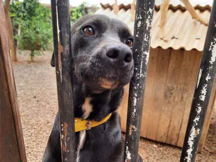 Em buscar de um Lar, Cadela Preta recolhida da rua a alguns meses, chamada de Linda, muito carinhosa e gosta de brincar.
