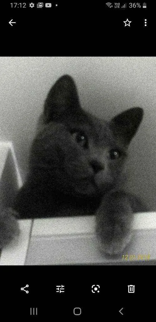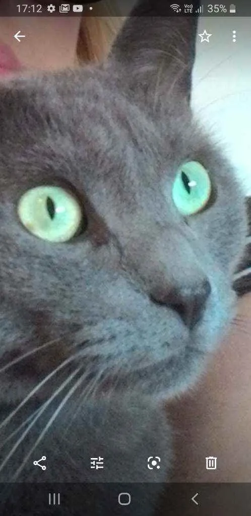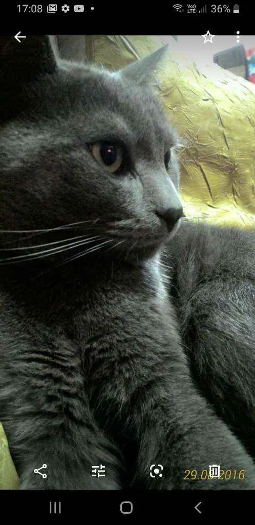 Gato macho castrado de 7 anos, pelagem curta, cor cinza, olhos verde água,porte grande.carinhoso,nunca dormiu fora de casa.ele tem problema urinario,com mts cristais,precisa de ração especial e desobstrução do canal com frequencia