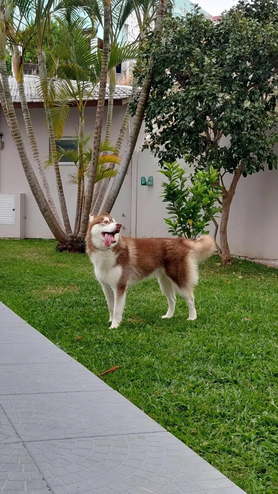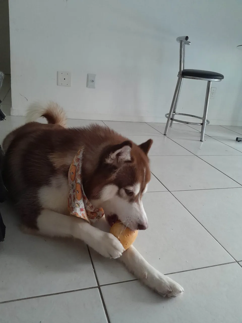 É um husky siberiano de pelagem branca e marrom, muito brincalhão, às vezes um pouco carente e ansioso. Ele precisa de espaço para se movimentar, tem muita energia e gosta de ter atenção, e por isso quem o adotar necessita ter isso em mente.