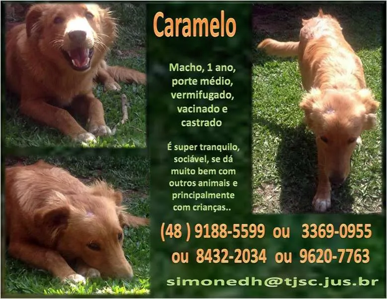 No dia 10 de agosto, quando estavam se aproximando da parada do ônibus situada na Osmar Cunha esquina com a Dom Jaime Câmara, em frente ao restaurante Texano, encontraram o Caramelo deitado sem reação. Não sabiam se tinha sido atropelado ou se estava com algum problema de saúde. Tentaram vários contatos com o Bem estar animal, Centro de Zoonoses, até mesmo o SAMUVET, porém sem sucesso. De inúmeras pessoas que se sensibilizaram com o fato, a Vanessa contatou sua amiga Simone, que solicitou o auxilio da Veterinária Lara do Consultório Veterinário Recanto da Mata. A Lara buscou o Caramelo no local e o levou para exames. Ele está bem, foi castrado e vacinado. Agora é necessário que uma família responsável o adote. É super tranquilo, sociável, se dá muito bem com outros animais e principalmente com crianças.. Está pronto e apto para ser adotado.